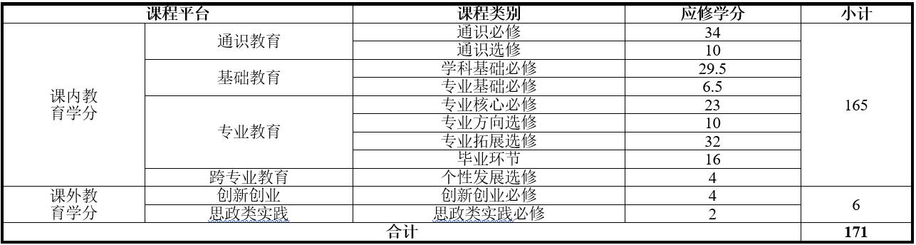 毕业最低学分为171学分,其中课内教学学分为165学分,课外教育学分为6学分。具体如下:
