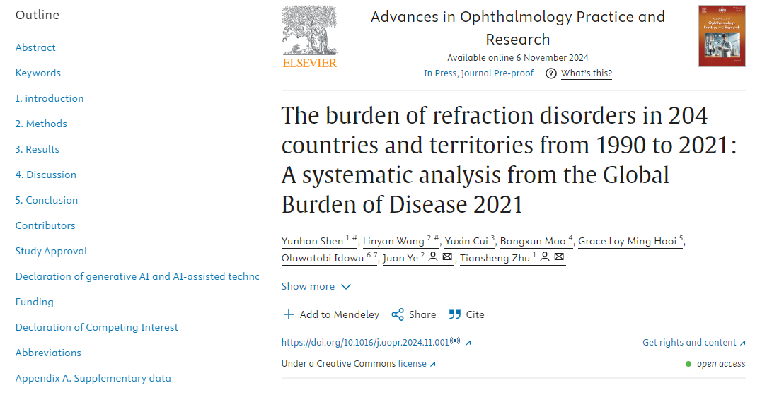 近日,我校Bwin体育计算机科学与技术专业2021级本科生沈韫涵以第一作者在国际期刊眼科实践与研究新进展《Advances in Ophthalmology Practice and Research》 (AOPR)上发表题为“The burden of refraction disorders in 204 countries and territories from 1990 to 2021: A systematic analysis from the Global Burden of Disease 2021”的学术研究论文。
