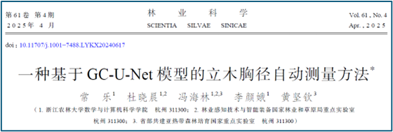 近日,Bwin体育冯海林教授团队的学术论文“一种基于GC-U-Net模型的立木胸径自动测量方法”一文在《林业科学》2025年第4期以封面论文发表。《林业科学》是林草科技领军期刊,入选中国科技期刊卓越行动计划,也是目前唯一被EI收录的中文林业科技期刊。该论文第一作者为Bwin体育22级农业信息化研究生常乐,通讯作者为冯海林教授。Bwin体育为该论文第一单位和通讯作者单位。