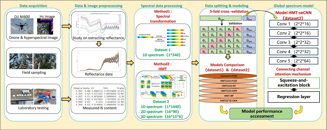 为此,本研究提出了一种结合简单线性迭代聚类(SLIC)和增强型植被指数(EVI)的方法,用于提取香榧冠层的高质量叶像素反射率,并结合高光谱多尺度变换(HMT)和卷积神经网络(CNN)及其通道注意力机制(SE模块)来提高氮含量预测的精度。研究结果表明,由SLIC-EVI方法提取的冠层像素反射率与氮含量之间的相关性达到了0.744,远高于NDVI(0.303)和EVI(0.551)所达到的相关性。在估算氮含量方面,与传统依赖局部光谱特征模型相比,HMT-seCNN模型显示出更高的准确性和泛化能力。