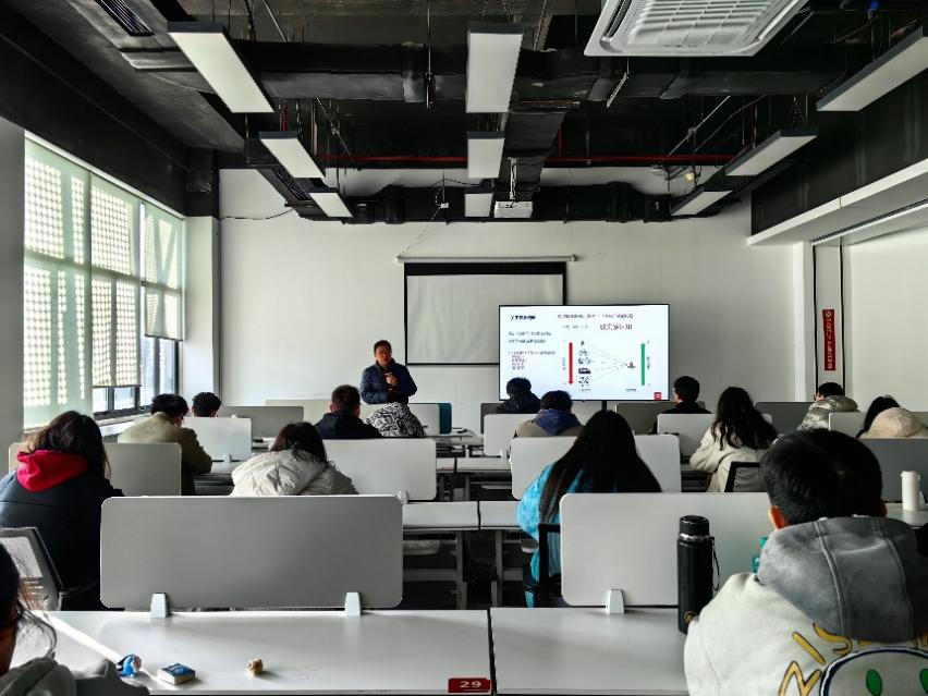 e游小镇和甲骨文数字科技产教融合基地的相关负责人对来访的师生表示了热烈欢迎,在工作人员陪同讲解下,同学们先后参观了e游小镇数字展厅、人才学院、青春公寓和产教融合基地,对e游小镇的特色政策和人才支持设施有了进一步的了解。参观结束后,团队前往人才学院,听取了产教融合基地负责人徐达老师的宣讲,徐达老师关于低代码平台开发优势和基地产教融合特色模式的详细介绍令同学们印象深刻。宣讲后的交流环节中,基地负责人也耐心细致地回答了同学们提出的问题。