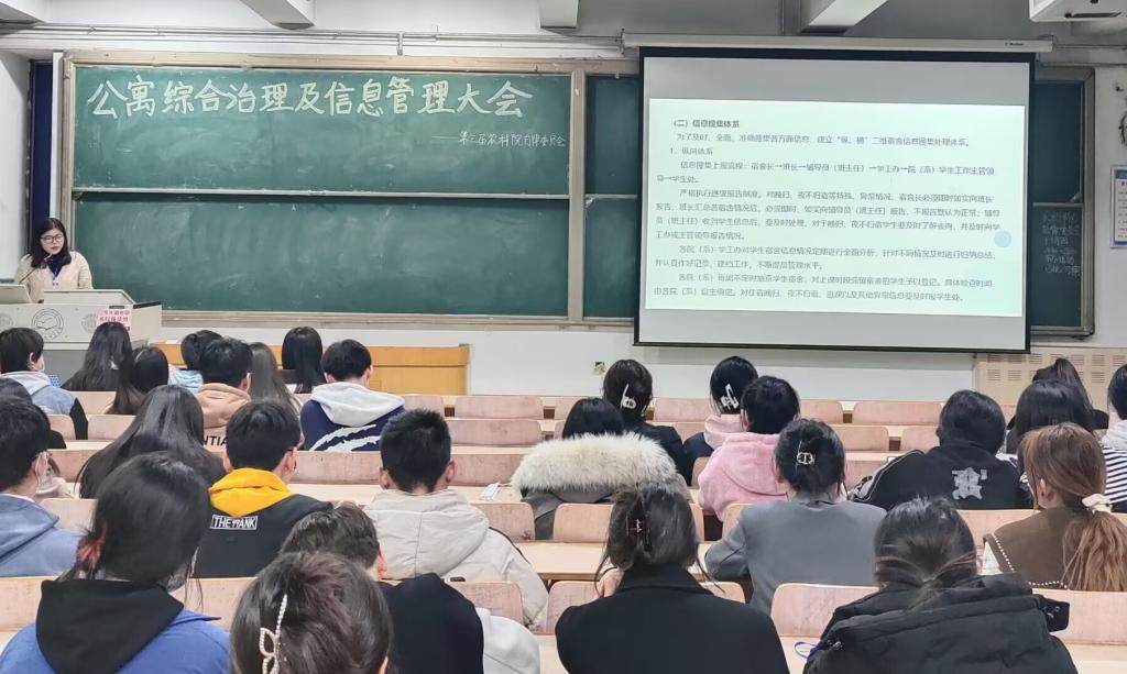 为了切实提高学院学生公寓管理水平,增强学生公寓信息搜集和处理能力,提升宿舍文化建设水平,2023年3月8日,beat365平台官方网站召开了宿舍综合治理和信息管理工作会议,主要就宿舍综合治理管理规定和宿舍文化建设等方面工作做了培训和交流。全院100余名宿舍长参加了会议。