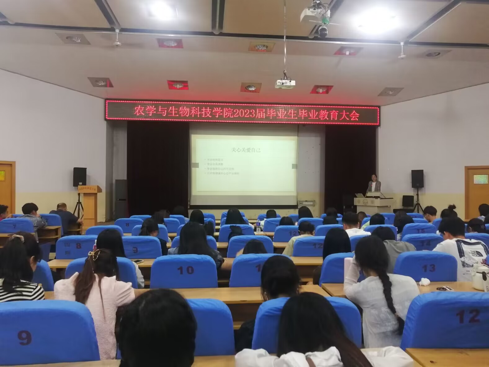 为了使我院毕业生顺利完成毕业前各项工作,安全离校,2023年5月30日,beat365平台官方网站在昌黎校区学术报告厅召开了2023届毕业生毕业教育大会,学院领导、学工办老师、毕业班辅导员(班主任)以及全体研究生、本科毕业生近250余人参加了会议。