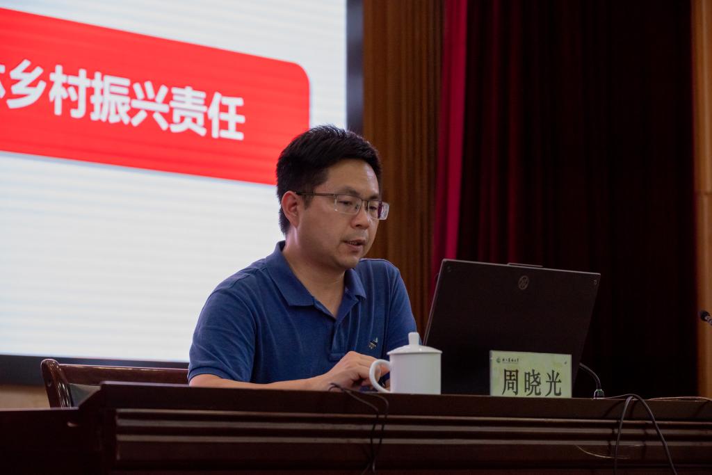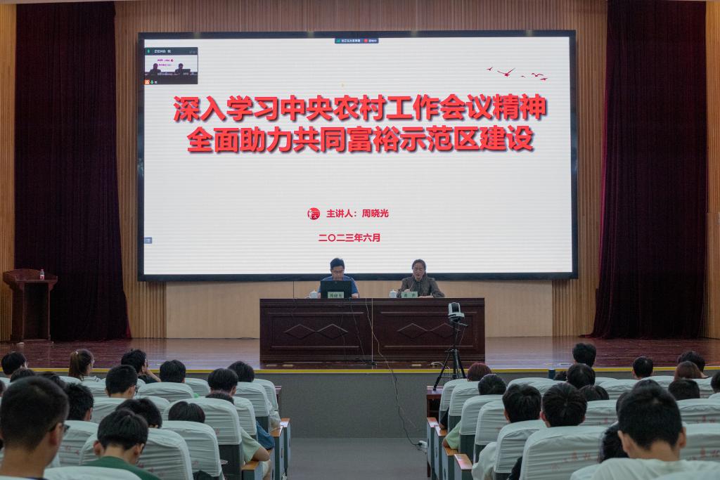 周晓光从“中央有号召:学深悟透中央农村工作会议精神”、“省域有示范:奋力推进共同富裕示范区建设”、“学校有行动:勇于担当农林乡村振兴责任”三个方面进行详细讲解,和大家一起学深悟透中央农村工作会议精神,为同学们在见证和助力建设共同富裕示范区的历史洪流中找到人生的坐标、实现自身的价值。