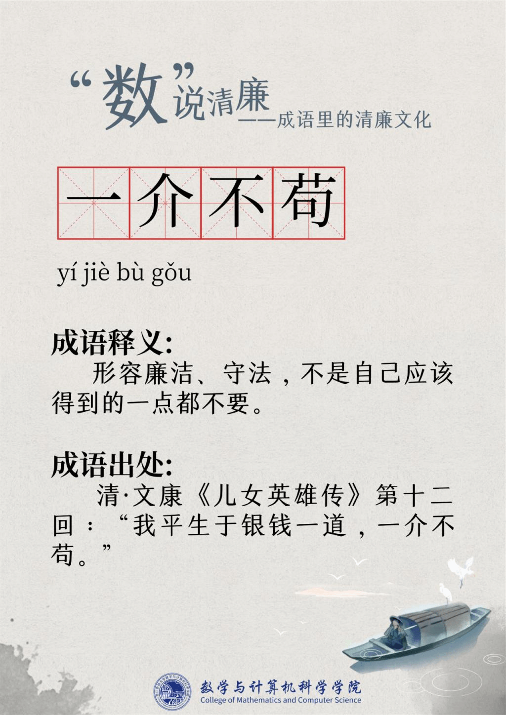 “廉洁”一词最早出现在屈原的作品“宁廉洁正直以自清”中。为人清廉正直从古至今都被视作立身处世最重要的品质之一。习近平总书记曾强调要“加强新时代廉洁文化建设涵养求真务实,团结奋斗的时代新风”。为深入挖掘中华传统文化中数字与成语诗词结合的廉洁要素,展现“廉洁”在中国传统文化瑰宝中浓墨重彩的独特地位,充分发挥清廉文化浸润校园、春风化雨的积极作用,Bwin体育现推出“数”说清廉——成语里的清廉文化系列文章,以传统文化之土壤培育清廉之花。