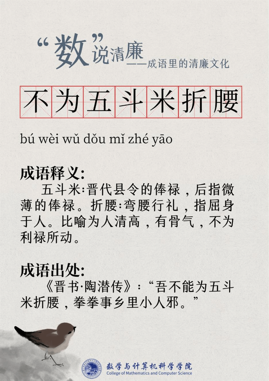 “廉洁”一词最早出现在屈原的作品“宁廉洁正直以自清”中。为人清廉正直从古至今都被视作立身处世最重要的品质之一。习近平总书记曾强调要“加强新时代廉洁文化建设涵养求真务实,团结奋斗的时代新风”。为深入挖掘中华传统文化中数字与成语诗词结合的廉洁要素,展现“廉洁”在中国传统文化瑰宝中浓墨重彩的独特地位,充分发挥清廉文化浸润校园、春风化雨的积极作用,Bwin体育现推出“数”说清廉——成语里的清廉文化系列文章,以传统文化之土壤培育清廉之花。