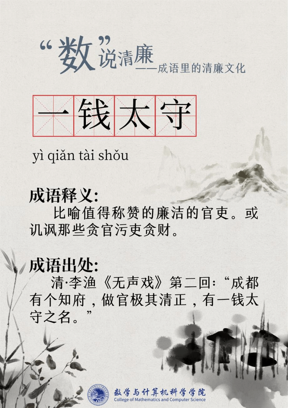 “廉洁”一词最早出现在屈原的作品“宁廉洁正直以自清”中。为人清廉正直从古至今都被视作立身处世最重要的品质之一。习近平总书记曾强调要“加强新时代廉洁文化建设涵养求真务实,团结奋斗的时代新风”。为深入挖掘中华传统文化中数字与成语诗词结合的廉洁要素,展现“廉洁”在中国传统文化瑰宝中浓墨重彩的独特地位,充分发挥清廉文化浸润校园、春风化雨的积极作用,Bwin体育现推出“数”说清廉——成语里的清廉文化系列文章,以传统文化之土壤培育清廉之花。