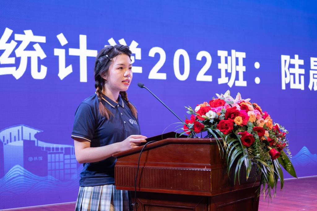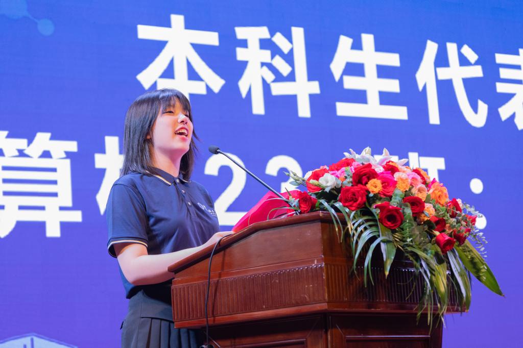 计算机科学与技术专业专任教师陈哲艺作为教师代表用全英文演讲的方式,鼓励同学们要满怀对知识的追求,理解和尊重不同的观点,不断磨练自己的毅力,多多结交良师益友,在知识的碰撞中茁壮成长,成为能够堪当民族复兴大任的有用之才。在校生代表应统202班的陆晨三同学、本科生新生代表计算机234班沈梦瑶同学、研究生新生代表数计研232班袁俊超同学先后发言。