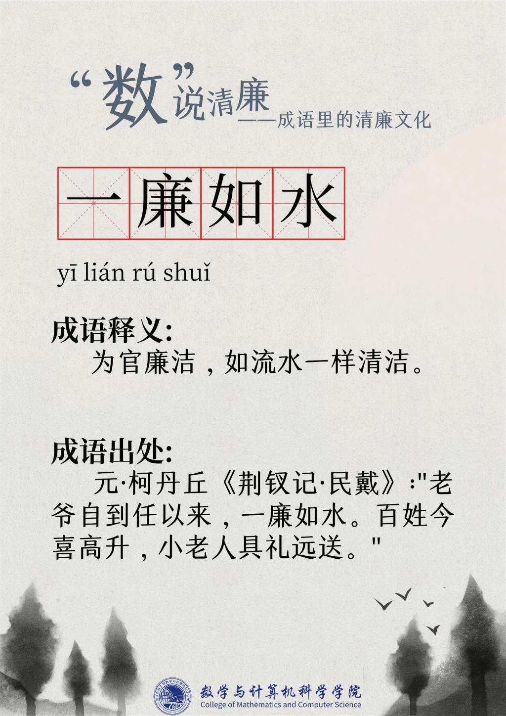 “廉洁”一词最早出现在屈原的作品“宁廉洁正直以自清”中。为人清廉正直从古至今都被视作立身处世最重要的品质之一。习近平总书记曾强调要“加强新时代廉洁文化建设涵养求真务实,团结奋斗的时代新风”。为深入挖掘中华传统文化中数字与成语诗词结合的廉洁要素,展现“廉洁”在中国传统文化瑰宝中浓墨重彩的独特地位,充分发挥清廉文化浸润校园、春风化雨的积极作用,Bwin体育现推出“数”说清廉——成语里的清廉文化系列文章,以传统文化之土壤培育清廉之花。