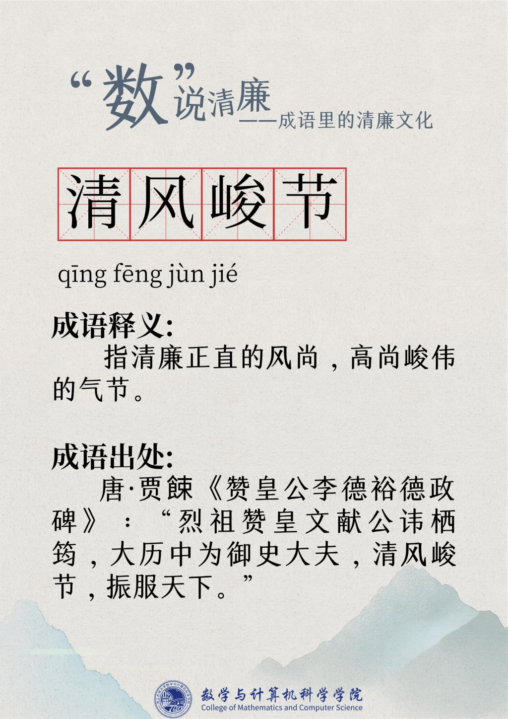 “廉洁”一词最早出现在屈原的作品“宁廉洁正直以自清”中。为人清廉正直从古至今都被视作立身处世最重要的品质之一。习近平总书记曾强调要“加强新时代廉洁文化建设涵养求真务实,团结奋斗的时代新风”。为深入挖掘中华传统文化中数字与成语诗词结合的廉洁要素,展现“廉洁”在中国传统文化瑰宝中浓墨重彩的独特地位,充分发挥清廉文化浸润校园、春风化雨的积极作用,Bwin体育现推出“数”说清廉——成语里的清廉文化系列文章,以传统文化之土壤培育清廉之花。