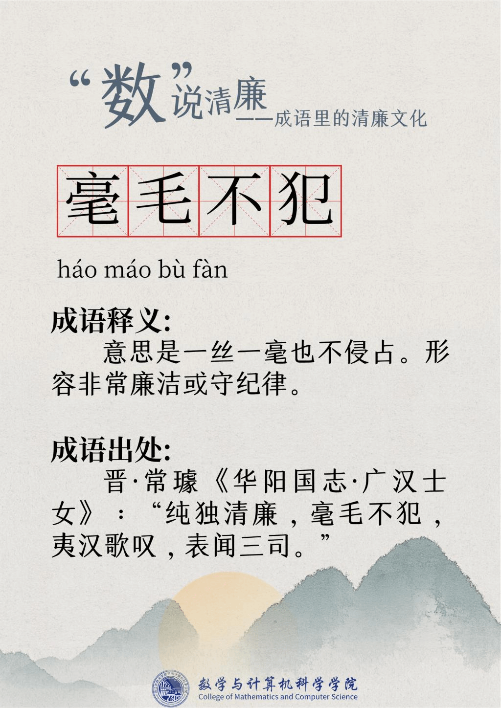 “廉洁”一词最早出现在屈原的作品“宁廉洁正直以自清”中。为人清廉正直从古至今都被视作立身处世最重要的品质之一。习近平总书记曾强调要“加强新时代廉洁文化建设涵养求真务实,团结奋斗的时代新风”。为深入挖掘中华传统文化中数字与成语诗词结合的廉洁要素,展现“廉洁”在中国传统文化瑰宝中浓墨重彩的独特地位,充分发挥清廉文化浸润校园、春风化雨的积极作用,Bwin体育现推出“数”说清廉——成语里的清廉文化系列文章,以传统文化之土壤培育清廉之花。