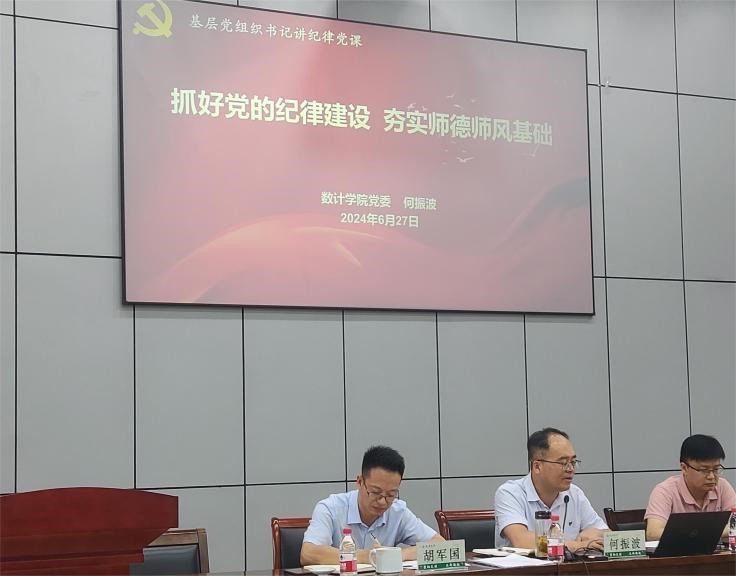 何振波以“抓好党的纪律建设、夯实师德师风基础”为题讲授纪律党课。他要求,大家要深刻认识从严抓好党的纪律建设,夯实师德师风基础,持续护航学院健康持续发展的重要性;要严格遵守《新时代高校教师职业行为十项准则》,以警示教育通报案例为戒,在日常工作中扎紧学院师德师风制度篱笆;要持续推进基层党建和事业融合发展,加强基层治理,涵养风清气正的学院政治生态。结合暑期工作,他对安全稳定、招生就业、教职工疗休养等工作进行了部署说明。