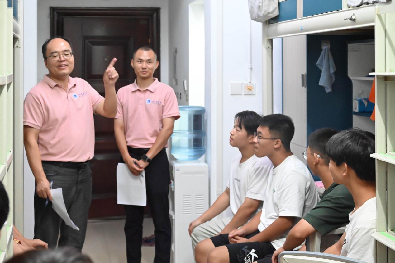 为了解Bwin体育2024级新生入学报到、入住寝室的情况,帮助新生更快适应大学环境,融入校园生活,9月8日晚上,学院党委书记何振波、党委副书记黄萍、副院长张洪涛、胡军国在学院辅导员的陪同下深入学生寝室,与2024级新生进行亲密交流。
