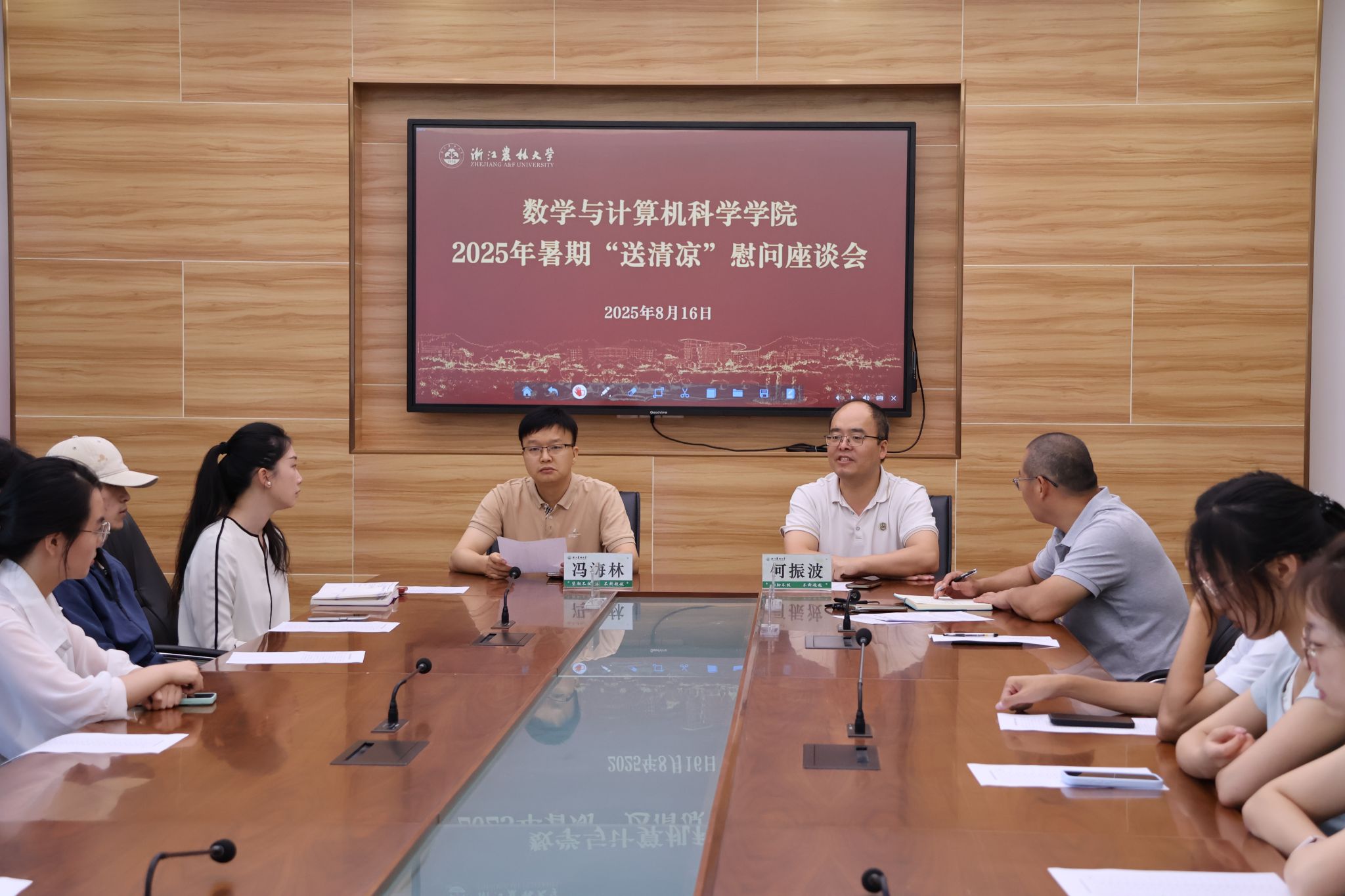 8月16日上午,Bwin体育在学11-304开展暑期留校学生“送清凉”慰问座谈会,学院院长冯海林、党委书记何振波、党委副书记孙晓民、学生办辅导员及留校备考学生代表参加此次活动。